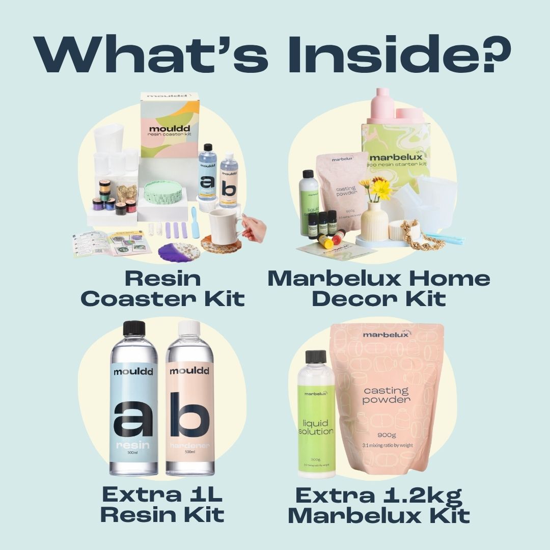 - Resin Coaster Kit (1L resin/hardener, reusable tools, 4 coaster moulds, 6 mica colours, gold leaf foil)